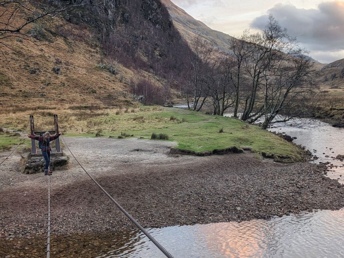 Parked up in the Ford Explorer (shout out to my adventure car) and headed up the well made path to the Steall Falls. Here we chose to cross a wire bridge. We could have taken our shoes off and waded the river instead. If you don’t like wire bridges this could be an option for you. I didn’t want to get wet feet, and wanted to test my courage on the bridge. I don’t like heights, I don’t like wire bridges – I knew there was a ridge and some scrambling coming up later in the day and reasoned that if I couldn’t manage this bridge I would struggle later.
