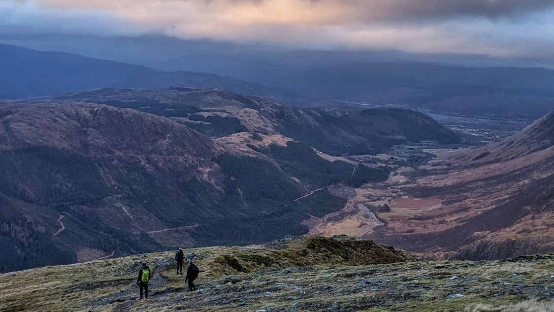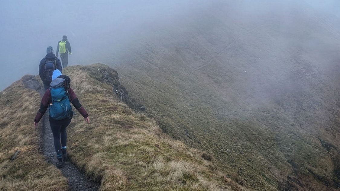 Climb steadily up the first Munro An Gearanach (982 meters) which was a straightforward climb. I was also very keen to keep moving due to the river incident. As we got to the top, the weather started to close in and we lost the views.