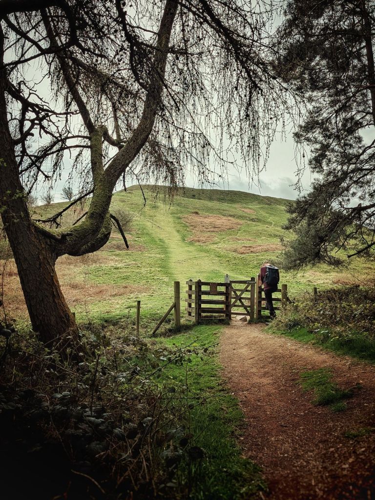 Eventually, the path flattens out a little and you come through the last of the trees to a gate which leads to the top of the hill. There is a trig point there for those who love a trig.