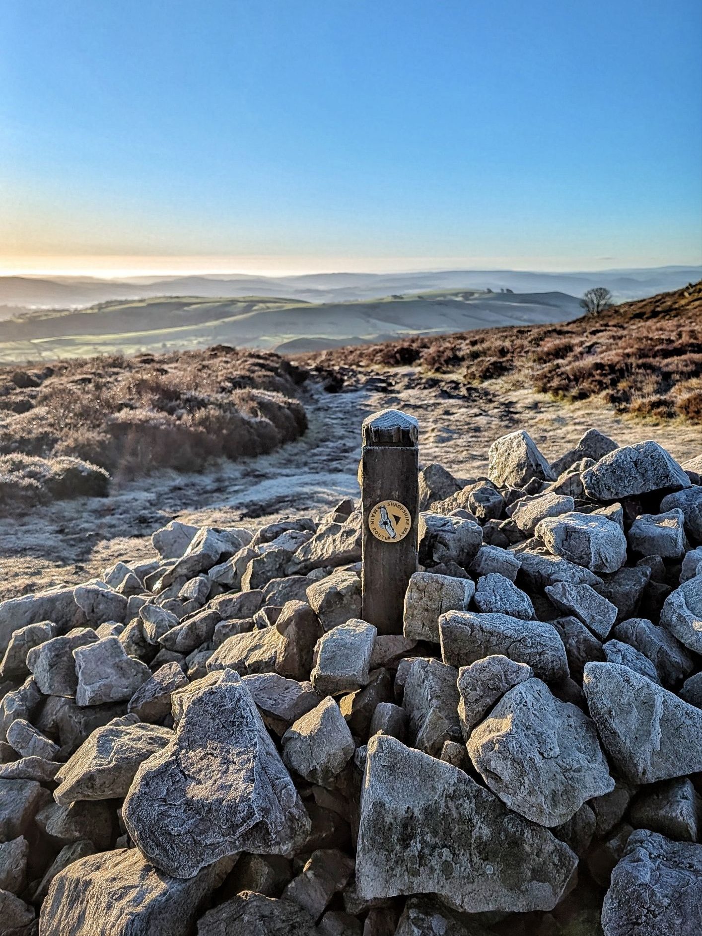You will see the distinctive shape of The Devil’s Chair and beyond it Manstone Rock with its trig point. Both rocks can be climbed, with different routes to the top. Some care is needed and the rocks can be slippery when wet or icy.